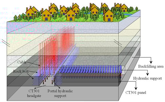 The roof and floor of the coal seam consist predominantly of soft rocks with poor stability. Mining the 3-1 coal seam is likely to damage the overlying strata, leading to caving or collapse zones. To protect surface structures, a full backfill method is planned for managing the roof using gob. The CT301 panel has a length of 265 m. The mining and filling operations follow a “three-mining, one-filling” cycle, with a filling step distance of 2.6 m. One mining and filling cycle is completed daily. GER is implemented in the CT301 headgate. The layout of the working face is shown in Figure 3.