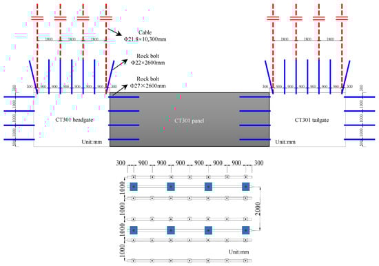 As shown in Figure 15, the CT301 headgate uses a combined support method of bolt, mesh, cable, and steel belt. Roof bolts are selected as left-handed threaded steel bolts with a spacing of 900 mm × 1000 mm, with 7 bolts per row, with specifications φ22-L2.6 m. A diamond mesh (φ6.5 mm metal mesh, grid size 100 × 100 mm) is used, along with Q235 steel butterfly-shaped trays (150 × 150 × 10 mm). Two ribs use fiberglass bolts, with a spacing of 1000 × 1000 mm, four bolts per row (specifications φ27 × L2.6 m). A plastic mesh HBPP30-30MS (grid size 40 × 40 mm) is used for the ribs support. The roof cables are steel strands (φ22-L10.3 m), with an anchoring spacing of 1800 × 2000 mm and 4 strands per row. Each cable uses three solidifying agents, and the pretension force is not less than 260 kN, with Q235G steel trays (300 × 300 × 16 mm).