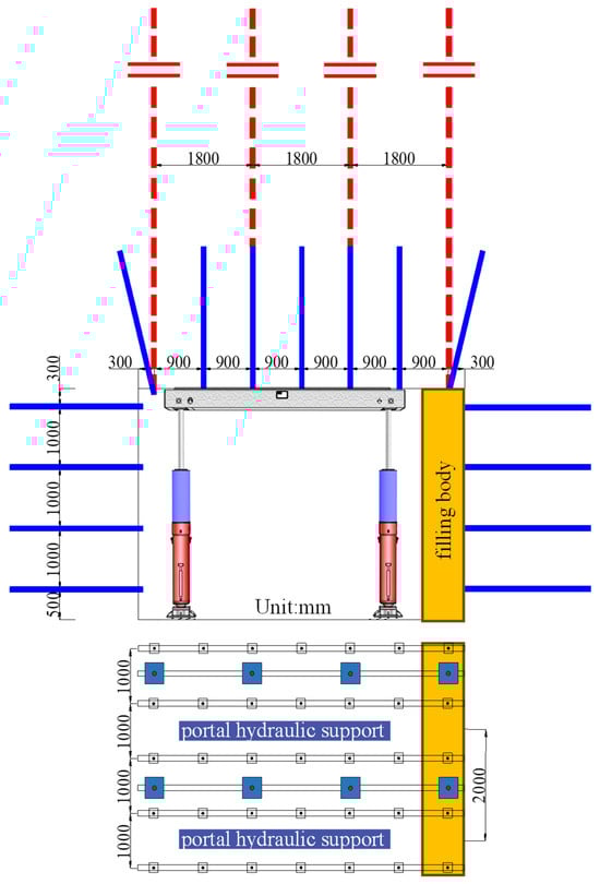 The original dimensions of the CT301 headgate (width × height) are 6000 × 3800 mm. After applying the GER technique with paste backfill, the original coal is replaced by the filling material. With a backfill ratio of 95%, the dimensions of the retained roadway (width × height) are 5200 mm × 3800 mm, ensuring that the section of the roadway meets the needs of the subsequent mining face. Based on the theoretical and numerical simulation results, as well as the site conditions, a surrounding rock control system centered on “basic bolt-mesh-cable support + portal hydraulic supports” has been developed. The layout of the GER support system is shown in Figure 14.