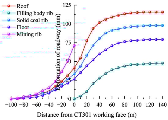 As shown in Figure 8, the roof, floor, and two ribs displacement curves of the roadway 100 m behind the working face are presented under backfill ratios of 65%, 75%, 85%, and 95%.