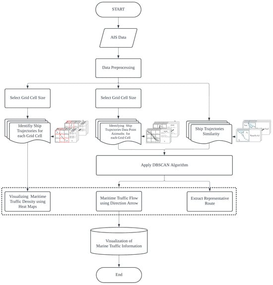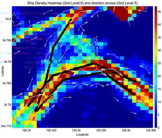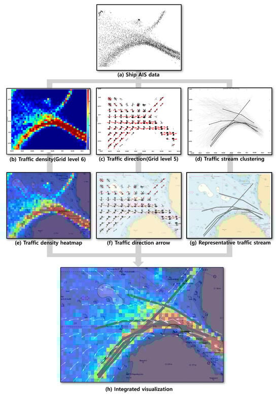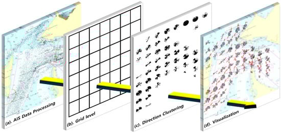 Based on the International Hydrographic Organization (IHO)’s development of next-generation hydrographic information [], this study identifies and visualizes traffic behavior information, such as maritime traffic density, direction, and flow, to assist ship operators in effectively understanding maritime traffic trends in a specific sea area and inform on the application of next-generation hydrographic information systems. Consequently, we analyzed and preprocessed Automatic Identification System (AIS) data collected in a specific sea area to calculate vessel density distribution within a grid. Additionally, we used machine learning techniques, such as unsupervised learning, to identify traffic direction and flow and extract representative routes. Unlike existing visualization methods, we propose an integrated visualization processing method that combines maritime traffic data with time-series dynamic ship navigation data, enabling simultaneous display of both sets of information.