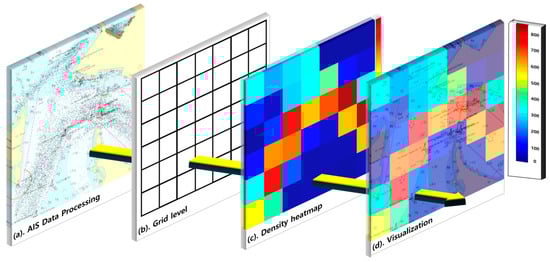 Process of flow for traffic density visualization. (a) Preprocess AIS data to analyze maritime traffic density and (b) assign the preprocessed data to a grid-level partitioned space. (c) Calculate the number of vessels passing through the grid cells and display the results in the form of a heatmap. (d) Overlay the heatmap on an electronically mapped map for visualization.