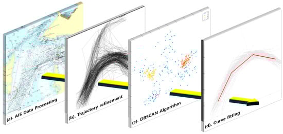Process of flow for traffic stream visualization. (a) Preprocessing AIS data to analyze maritime traffic density. (b) Applying the Douglas–Peucker algorithm to simplify vessel travel paths and the DTW algorithm to measure the similarity between vessels’ sailing paths. (c) Performing clustering using DBSCAN algorithm. (d) Identifying traffic flows based on clustering results and extracting representative routes using the curve fitting method.