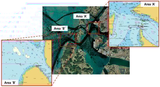 Additionally, the integrated visual processing results can be overlaid on an electronic nautical chart of the S-57 standard, which is currently used for the navigation and control of most ships (Figure 11). The simulation area “A” features three primary shipping lanes, with most ships concentrated along the route through the Mokpo Bridge. Notably, the azimuth of the vessels is limited owing to fixed obstacles such as surrounding lands and shallow waters.