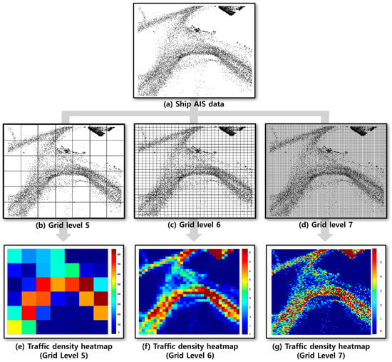 First, the received AIS data were organized into vessel-specific voyage data to identify the traffic density for area “A” of the target sea area. Subsequently, the cumulative data of the number of vessels passing through each cell were calculated for various grid sizes; the values are presented as a heatmap in Figure 7. Notably, the three different grid sizes (5, 6, and 7) tested revealed that the six-step grid provided the most suitable visualization of the maritime traffic density information.