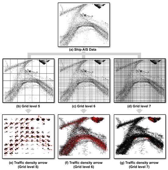 Comparison of ship direction arrow as per grid cell interval in area “A”: (a) Ship AIS data preprocessing and trajectory refinement. (b) Distribution of AIS data on grid level 5. (c) Distribution of AIS data on grid level 6. (d) Distribution of AIS data on grid level 7. (e) Result of direction arrow on grid level 5. (f) Result of direction arrow on grid level 6. (g) Result of direction arrow on grid level 7.