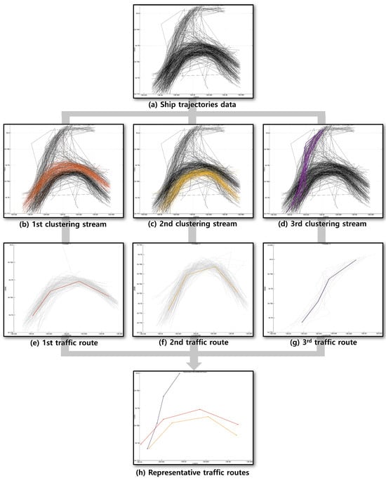 The process of extracting traffic flows and representative routes. (a) Preprocessed ship trajectory data and DBSCAN cluster analysis results for ship trajectory similarity for identifying the traffic stream. (b) First cluster of DBSCAN cluster analysis results. (c) Second cluster of DBSCAN cluster analysis results. (d) Third cluster of DBSCAN cluster analysis results. (e–g) Applying the curve fitting for identifying routes. (h) Integrated representative routes in the simulation area.
