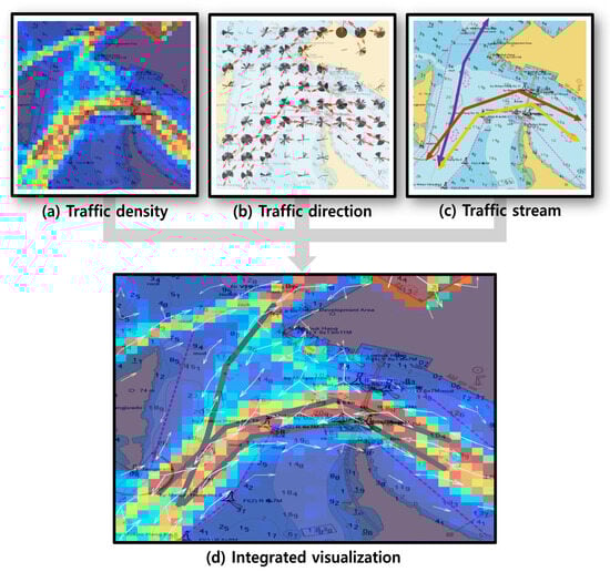 However, current maritime traffic and hydrographic information delivery systems have limitations that hinder navigators from achieving effective situational awareness. The existing hydrographic information does not provide comprehensive, real-time information regarding changes in maritime traffic conditions or vessel interactions. The next generation of hydrographic information, S-100, will improve the accessibility, compatibility, and usability of hydrographic and marine data by providing a new universal standard data framework for next-generation navigation technologies []. Among these, the S-101 standard provides a new technical structure for the efficient integration and visualization of various marine data. However, S-101 currently lacks specific visualization measures to provide navigators with maritime traffic behaviors, such as maritime traffic density, traffic flow, and representative routes. Consequently, it is necessary to utilize large amounts of maritime traffic data to analyze ship movements and traffic patterns, thus providing more intuitive and integrated information to navigators. Particularly, it is necessary to monitor and verify maritime traffic using current hydrographic information.
