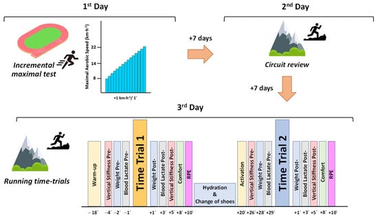 Overview of the experimental procedure performed over three days (incremental maximal test, circuit review and running time trials, respectively). Measurements were taken before (pre-) and after (post-) each time trial (Time Trial 1 and Time Trial 2). Rating of perceived exertion (RPE).