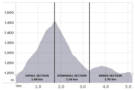 Running time trials (3rd Day). Seven days after previewing the circuit, the participants performed two running time trials on this circuit (CON and AFT) with a 30 min passive recovery in between. The order of the sets was randomized, as previously described. The circuit was located in Urrez (Burgos, Spain) at an altitude between 1.190 and 1.457 m above sea level, and it had an elevation gain of +305 m, which was representative of a typical mountain race (e.g., OCC Mont-Blanc) []. It consisted of three different segments: 1.68 km uphill, 1.56 km downhill, and 1.95 km of mixed terrain (a combination of uphill, flat, and downhill segments) (see Figure 2). The circuit was well-marked with trails and roads as in official competitions. The type of terrain represented the most common trails in mountain races (i.e., grass, loose stone, gravel, and mud) with low technical difficulty. Weather conditions on the testing day were also recorded (temperature: 11–15 °C; humidity: 85–92%; wind: 20–25 km/h WSW), and the test took place in autumn of the North hemisphere (November).