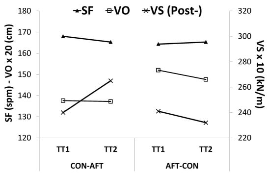 Representation of the biomechanical variables where an interaction between the shoe and the set (Shoe x Set) was observed. Time-trials (TT) order: conventional–advanced footwear technology (CON-AFT) and advanced footwear technology–conventional (AFT-CON). Step frequency (SF), vertical oscillation of the centre of gravity (VO), and vertical stiffness after the time trial (VS post-). Abbreviations: steps per minute (spm), centimeters (cm), kilonewtons per meter (kN/m).