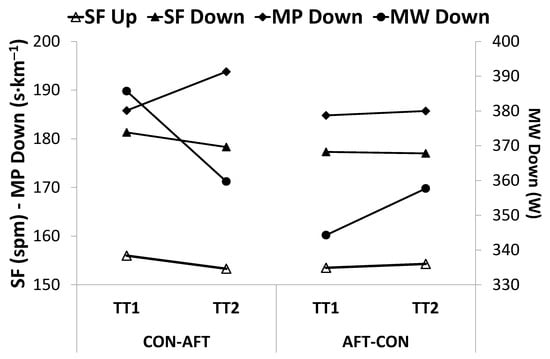 Representation of the biomechanical variables where an interaction between the shoe and the set (Shoe x Set) was observed during the uphill (Up, hollow markers) and downhill segments (Down, filled markers). Time trials (TT) order: conventional–advanced footwear technology (CON-AFT) and advanced footwear technology–conventional (AFT-CON). Step frequency (SF), maximal pacing (MP) and maximal power (MW). Abbreviations: steps per minute (spm), seconds per kilometer (s/km), watts (W).