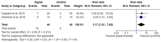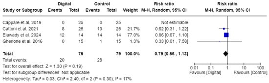 | Cappare et al., 2019 [6] | 50 | 150 | 150 | 50 | 100% | 100% | DG (1.11 ± 0.54); CG (1.07 ± 0.66), p > 0.05 | DG (08.59 ± 2.46) < CG (16.45 ± 4.49) (p < 0.05) | CG (0/25); DG (0/25) |
