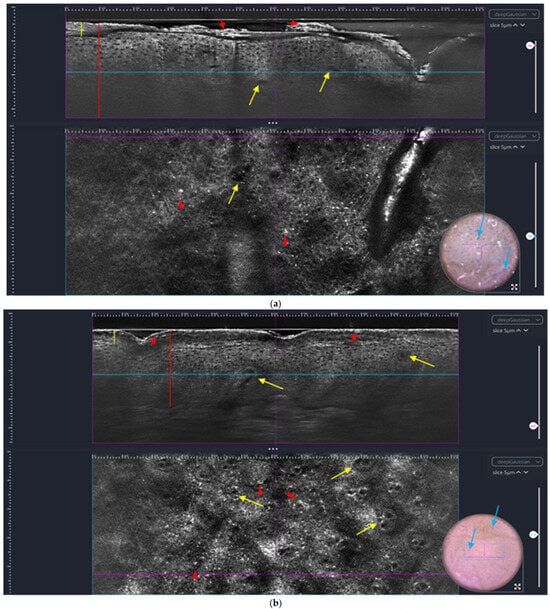 - Orsini, C.; Trovato, E.; Cortonesi, G.; Pedrazzani, M.; Suppa, M.; Rubegni, P.; Tognetti, L.; Cinotti, E. Line-field confocal optical coherence tomography: New insights for psoriasis treatment monitoring. J. Eur. Acad. Dermatol. Venereol. 2024, 38, 325–331. [Google Scholar] [CrossRef] [PubMed]