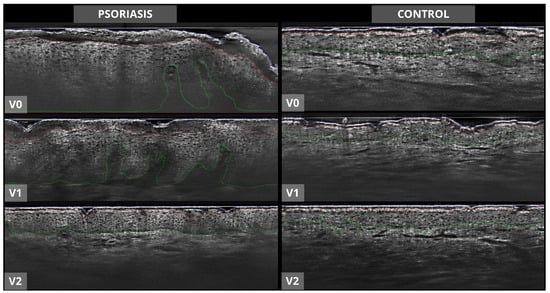 The artificial intelligence (AI) model segmented line-field confocal optical coherence tomography stacks (only the vertical view within the 3D stack depicted here, LC-OCT image size: 1.2 mm × 0.4 mm) of study plaque (left side) and control area (right side). Blue line = skin surface; red line = boundary between stratum corneum and stratum granulosum/living epidermis; green line = before dermo-epidermal junction. V0 = before therapy, V1 = after 4 weeks of therapy, V2 = after 12 weeks of therapy.
