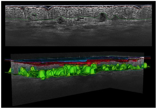 Three-dimensional (3D) line-field confocal optical coherence tomography (vertical image size: 1.2 mm × 0.4 mm; 3D image size: 1.2 × 0.5 × 0.5 mm3) stack with reconstruction of the artificial intelligence (AI) model-generated segmentation of skin layers (blue = skin surface, red = boundary between stratum corneum and stratum granulosum, green = dermo-epidermal junction).