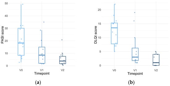 (a) Reduction in PASI score under therapy; (b) reduction in DLQI score under therapy. PASI = psoriasis area and severity index; DLQI = quality of life index. The thick horizontal line within each boxplot corresponds to the median.