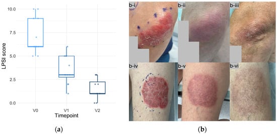 (a) Reduction in LPSI score for all patients at each study visit (V0 before therapy, V1 after 4 weeks, V2 after 12 weeks of therapy). (b) First patient’s clinical pictures of SP on the left elbow before therapy (b-i, LPSI 6), after 4 weeks (b-ii, LPSI 2), and 12 weeks (b-iii, LPSI 2) after therapy; second patient’s clinical pictures of the SP left ventral thigh before therapy (b-iv, LPSI 9), after 4 weeks of therapy (b-v, LPSI 6), and after 12 weeks of therapy (b-vi, LPSI 1). LPSI = local psoriasis severity index. SP = study plaque. Thick horizontal line in the boxplot = median.