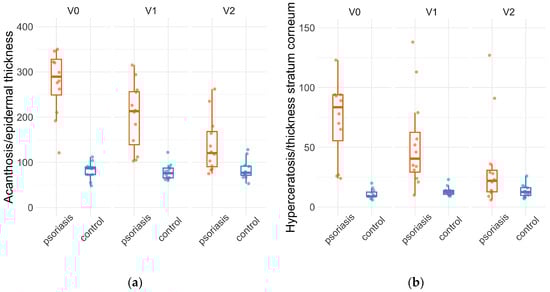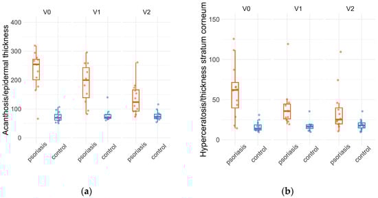 (a) AI model measurement of epidermal thickness/acanthosis (in µm) in the SP (orange) and CoA (blue) before (V0) and under therapy (V1 after 4 weeks, V2 after 12 weeks); (b) AI-model measurement of stratum corneum/hyperkeratosis (in µm) in the SP (orange) and CoA (blue) before (V0) and under therapy (V1 after 4 weeks, V2 after 12 weeks). SP = study plaque, CoA = control area; µm = micrometer.
