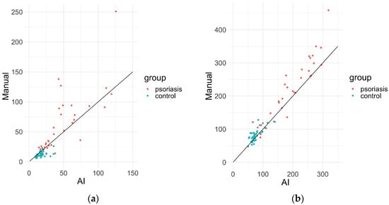 (a) Correlation between artificial intelligence (AI) and subjectively scored measurements for the stratum corneum thickness comparing all lesions and timepoints; (b) correlation between AI-supported and subjectively scored measurements of the epidermis thickness in µm, analyzing all lesions and timepoints. Black line = indicating dot position for perfect match of the measurements.