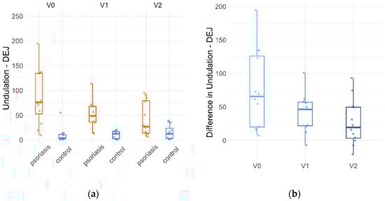 (a) DEJ undulation in percentage in the SP and CoA before therapy (V0) as well as after 4 weeks of treatment (V1) and 12 weeks of treatment (V2); (b) difference in DEJ undulation between SP and CoA before therapy (V0) as well es in the course of treatment (V1, V2). SP = study plaque; CoA = control area, DEJ = dermo-epidermal junction.