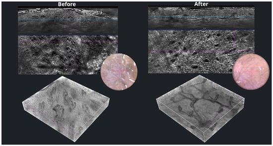 Depiction of vessels at V0 (‘Before’) and V2 (‘After’ 12 weeks of therapy) via line-field confocal optical coherence tomography (deepLiveTM, Paris, France) (upper image part of vertical and horizontal view (vertical image size: LC-OCT image size: 1.2 mm × 0.4 mm; horizontal image size: 1.2 mm × 0.5 mm), blue line corresponding to the height of the depicted horizontal image within the 3D stack, purple line corresponding to the location of the depicted vertical image within the 3D stack, accompanying dermoscopy picture (image size: 1.2 mm × 0.5 mm), bottom minimal rendering of 3D block for better visualization of vessels (3D image size: 1.2 × 0.5 × 0.5 mm3)). Initially, there were highly increased vasculature and typical glomerular vessels in elongated rete ridges; after 12 weeks of therapy, despite clinical remission there is a persistence of augmented vascularization; and now, more reticular vessels can be seen but the ends of the vessels still have a glomerular aspect (for a video animation of the vasculature, please see S1 and S2 in the Supplementary Section).