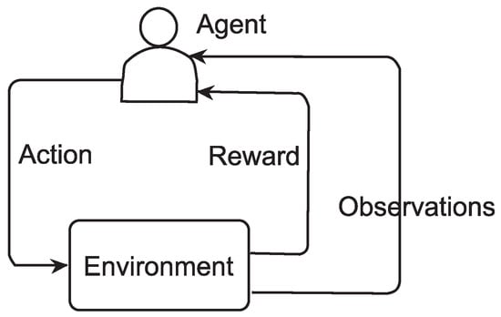 In Figure 1, we present an illustration of agent–environment interaction in reinforcement learning. In this machine learning scenario, agents can act in the environment and acquire observations. The goal of an agent is to maximize reward.