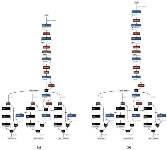 This figure presents two example agent brains trained with PPO consisting of convolutional image feature extractor and classification layers constructed by two 16-neuron layers. The names of the individual network elements are derived from the notation according to the ONNX data exchange standard (Open Neural Network Exchange, https://onnx.ai/onnx/ [accessed on 9 October 2024]). Gemm is matrix multiplication, Mul is element-wise multiplication, and Slice produces a slice of the input tensor along axes. Visualization was performed using Onnx-modifier software https://github.com/ZhangGe6/onnx-modifier [accessed on 9 October 2024]. (a) Agent’s NN with “Simple” convolutional feature extractor. (b) Agent’s NN with “Nature” convolutional feature extractor [].