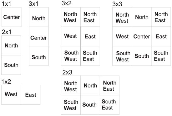 The limitation of the number of features should be tuned so that the new set of features retains information about the spatial position of objects in the image and is easy to interpret for human cognitive interpretation. The labels of individual features should also be easy to identify. To meet all these requirements, we use a proxy geometry known for creating visual human–computer interfaces [] based on dividing the space into up to parts whose names are based on geographic directions. Depending on the resolution of the GradCAM map , there may be several combinations of the set of proxy geometries, which we show in Figure 3. The type of proxy geometry is calculated according to Algorithm 1 by executing it for the values n and m, and the proxy region borders thus built are stored in variables , respectively. The naming convention for the individual features that are in matrix F is as in Figure 3. This algorithm does not consider the size of the input image I but the resolution of . This is because if has a relatively small resolution, after scaling it to the resolution of I and extracting features from it in the rest of the algorithm, interpolation of map values during resampling may result in the assignment of objects from different areas of to one proxy geometry area. If the resolution of is much smaller than the resolution of the image, this can result in an erroneous averaging of the excitation areas of into several adjacent proxy geometry areas.