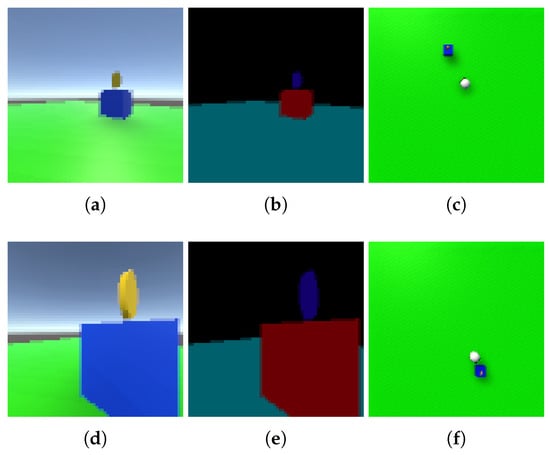 The next important step is to extract the semantic information from the input image, in other words, segmenting the objects that make up the observed scene. This is an intuitive approach: to understand the operation of the decision-making process based on the image content, the user does not derive relevant information from the color values in the observed proxy geometry area but is rather interested in the types of objects that the algorithm observes. It is therefore necessary to provide a semantic segmentation of the observed scene to the explanatory algorithm. Another machine learning algorithm can be used for this, for example, [,,,], or if the algorithm is tested in a virtual environment, data can be obtained directly from it. Nowadays, reinforcement learning model evaluation in the virtual environment is a common and much cheaper approach than building a real-life prototype [,], so we can assume that it is possible to obtain semantic data directly from the virtual environment. In Figure 4, we show an example visualization of the virtual world as seen by an agent (first column) and a semantic segmentation of the objects visible in the scene (second column).