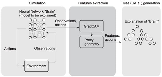 A block diagram summarizing the proposed methodology. At first, during the simulation, we gather observations and actions of the agent. Then, with the help of GradCAM and proxy geometry (see Algorithm 1), features are generated (see Algorithm 2). Those features and the agent’s actions are used to create an approximation of the neural network brain of an agent in the form of a decision tree (CART).