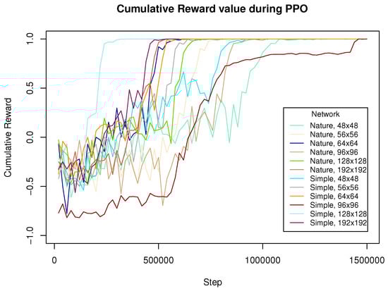 We performed all 12 experiments described in Section 2.6. A total of episodes were enough for each evaluated NN model to obtain efficiency in solving the problem of acquiring a Collectible object by an Agent. The plot with Cumulative Reward value during PPO training is presented in Figure 6. The vertical axis presents the number of training steps, while the vertical axis presents the cumulative reward of an agent. After training the agents so that each configuration had efficiency, we generated recordings of 1000 consecutive images from that Agent’s visual sensor and the corresponding semantic segmentations for those images. We used these images and segmentations to generate explanations according to our proposed method and validation with the leave-one-out test. In other words, each CART tree was trained on 999 images and validated on one, and the validation process was repeated 1000 times for each tree. A detailed description of the experiment setup can be found in Section 2.6.
