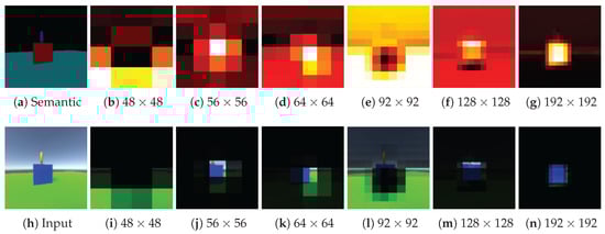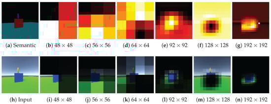 As can be seen in Figure 6, all tested configurations of NNs trained with the PPO algorithm established effectiveness in solving the problem described in Section 2.6 after no more than episodes. For an observer who visually compares individual Agents’ actions, they behaved similarly in a virtual environment. At first, they made rotational movements until they did not find the Platform/Collectible object. They then moved toward it by jumping at the right moment, which allowed them to reach the Collectible object. However, each of these networks worked in a slightly different way. An important factor was that we used two feature extractors, “Simple” and “Nature”, which differed in the number of layers and the resolution of the last convolution layer. Also, the data coming from the input vision sensor varied significantly in resolution, from up to . Thus, it was natural that the feature image extractor that provided different input data determined the inference by the following fully connected neural layers with sigmoid activation functions (see Figure 2). Example performance visualizations of convolution neural with various input image resolution networks processed by semantic segmentation and GradCam for the same input image can be seen in Figure 7 and Figure 8. Aware of a certain simplification, we call the area of the GradCAM map where the averaged gradient obtained the most significant value in this discussion the area observed by the Agent. In some cases, such an observable area was those portions of the map where the entire Platform or Collectible the Agent was aiming at was located. This situation happened in Figure 7c,g and Figure 8e. However, this was not the general rule. Sometimes the observed area included only a portion of the target, for example, in Figure 7f and Figure 8g, or the target and a portion of its surroundings, as in Figure 7d,e and Figure 8b–d,f or did not observe the area at all and observed only its surroundings like in Figure 7b. By GradCAM’s assumption, these areas were the most influential in separating images into the different classes of activity performed by the Agent.