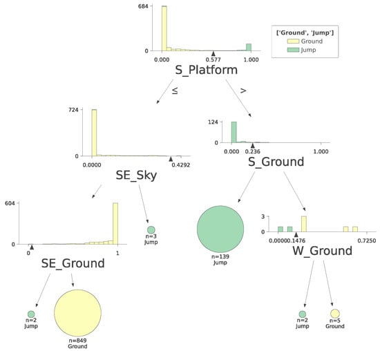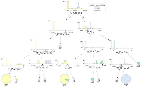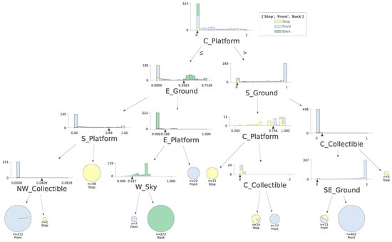 In Figure 9, Figure 10 and Figure 11, we present a CART explanation generated by the proposed GradCAM-based method for the Agent’s NN with input image signal, “Simple” convolutional feature embedder, and parameters of Algorithm 2. Those trees explain the rules of front–back, left–right, and jumping motion, respectively. Instances of classes among certain features are presented in color-coded bars. The black arrow positioned under the horizontal axis indicates the splitting threshold.