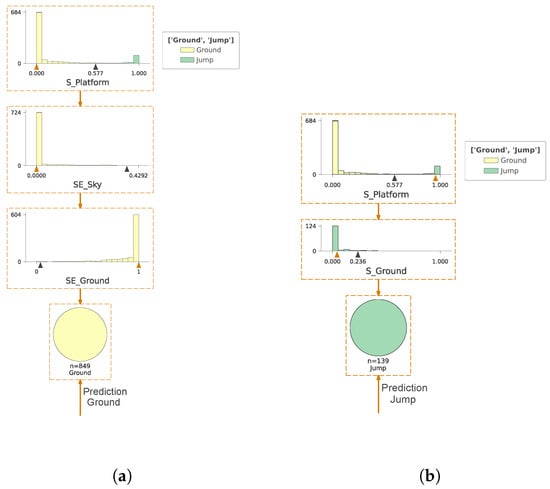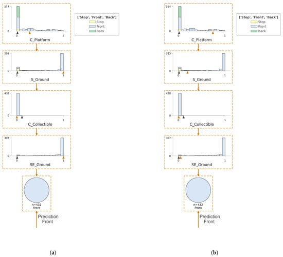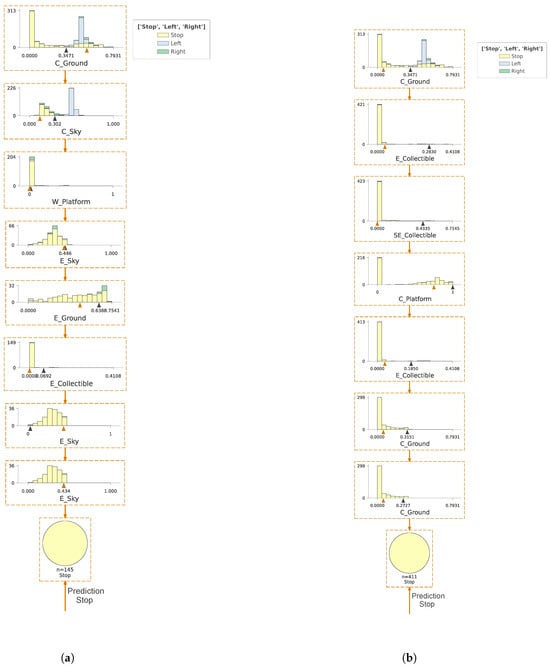 The decision trees that were generated using the method described in Section 2.4 were relatively easy to interpret. In the case of the experiment described in Section 2.6, we obtained three trees for each parameter setting, examples of which can be seen in Figure 9, Figure 10 and Figure 11. They approximated the NN decision classifying forward–backward moving, left–right turning, and jumping, respectively. Example decision paths of these trees are shown in Figure 12, Figure 13 and Figure 14. The decision paths should be analyzed in conjunction with Figure 4, which shows the input image to the NN network. In Figure 12 for both images, the decision to move forward was made. As can be seen, such a decision was made when the Central part of proxy geometry was occupied by an object of class Platform, the South part of the geometry was occupied by an object of class Ground, there was a low number of pixels of Collectible class in the Center, and there were pixels of class Ground in the South-East. In other words, the Agent moved forward if there was Ground under its “legs” and a Platform and a Collectible in front of it. In Figure 13, in both cases, the decision was “Stop”, which means there was no turn in the left or right directions. As can be seen, the decision was based on the statistic that Agents did not turn if both to the left and right of the Agent there were not a sufficiently large number of pixels belonging to the Platform and Collectible classes. Figure 14 shows the situation when the Jump was not made (a) and when the Agent jumped (b). As can be seen, the Jump was not executed because in the South area, there were not enough pixels belonging to the Platform class, and in the South East direction, there were no pixels belonging to the Sky class, but there were pixels of the Ground class. As can be seen in tree (b), the Agent performed the Jump action when there was a Platform object and relatively few pixels of the Ground class in the South area, in the region very close to the Agent. The Agent decided to jump when it moved close enough to the Platform.