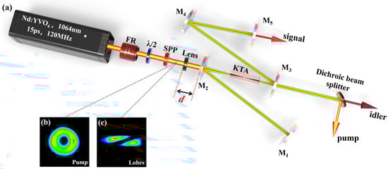The experimental setup of this work is depicted in Figure 1a. An all-solid-state Nd:YVO4 laser served as the pump source for the OPO with an output wavelength of 1064 nm, a pulse width of 15 ps, a pulse repetition frequency of 120 MHz, a maximum average output power of 18 W, and a near-Gaussian spatial output profile (M2 < 1.3). A Faraday rotator (FR) was employed to eliminate the backward-reflected light and safeguard the Nd:YVO4 laser from damage. The incident power of the OPO was regulated through the combined use of a half-wave plate (HWP) and a thin-film polarizer. The pump beam was transformed into a vortex beam using an SPP, which exhibits an annular spatial intensity profile as shown in Figure 1b. The topological charge characteristics of the generated vortex beam were determined with the tilted lens method, and the two lobes in the spatial intensity profile of the beam observed through the lens arrangement, as shown in Figure 1c, confirmed that the pump vortex beam has a topological charge of ℓ = 1.