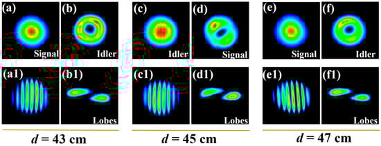 Generally, there are two methods for determining the order of the output optical vortex. One is that when an optical vortex beam of order ℓ passes through a tilted lens, it will be transformed into a multi-lobed beam with ℓ + 1 lobes []. The other is that when an optical vortex beam of order ℓ passes through a Mach–Zehnder interferometer, it will be transformed into a pair of forked fringes with a ℓ + 1 leg structure oriented in opposite directions []. Based on this, the beam output mode can be ascertained. As depicted in Figure 2, the spatial intensity profiles and the profiles of the output signal and idler fields are presented for different focus positions of the pump vortex beam when passing through a Mach–Zehnder interferometer or a tilted lens. Notably, d denotes the distance between the pump beam focusing lens and M2. By adjusting the position of the focusing lens, d was set to 43 cm, 45 cm, and 47 cm. Under these conditions, the focal point of the pump vortex beam was positioned at the front, middle, and rear of the KTA crystal, respectively.