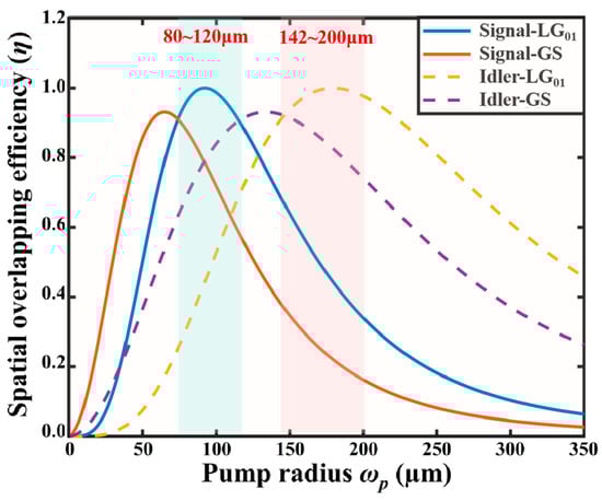In this theoretical model, the mode sizes of the signal (ωs = 92 µm) and idler fields (ωi = 180 µm), which were assumed to be fixed, at the center of the KTA crystal were determined based on the parameters of the OPO cavity mirrors using the ABCD resonator model. Subsequently, the spatial overlap efficiency between the pump field and the signal or idler fields as a function of the pump beam radius (ωp) was calculated and is presented in Figure 3. It can be observed that when the pump beam radius ranged from 80 to 120 µm; the spatial overlap between the first-order vortex mode (LG01) of the signal field and the pump field was higher compared to other modes, thereby reducing cavity loss and enabling the signal beam to oscillate in the vortex mode. As the pump spot size gradually increased (ωp > 142 µm), the spatial overlap between the first-order signal beam and the pump beam deteriorated, leading to increased diffraction loss within the cavity and forcing the signal beam to oscillate in the Gaussian (GS) mode. Due to the conservation of OAM and the improved spatial overlap between the LG01 of the idler beam and the pump beam, the pump beam transferred the OAM to the idler field output.