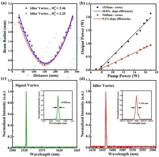 The spectral characteristics of the signal and idler fields are shown in Figure 4c and Figure 4d, respectively. The spectra were recorded using a scanning monochromator (SpectraPro HRS-500, PI, Trenton, NJ, USA) with 300 lines/mm, an aperture size of 30 μm, and a spectral resolution of 0.1–0.2 nm. The KTA crystal that complies with the NCPM can only output signal and idler fields of fixed wavelengths. The central output wavelength of the signal vortex field was located at 1535 nm in the near-infrared band, and the central output wavelength of the idler vortex field was placed at 3468 nm in the mid-infrared band. The full width at half maxima (FWHM) of the signal vortex and idler vortex outputs were measured to be Δλs = 0.502 nm and Δλi = 1.216 nm, respectively. Compared with a MgO:PPLN-OPO, the KTA-OPO in this work has lower temperature sensitivity and a narrower spectral acceptance angle, which results in narrower spectral linewidths and better monochromaticity of the output signal and idler fields [].