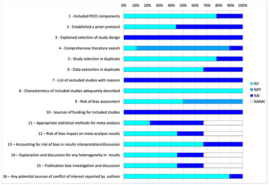 Nine systematic reviews (SRs) were included in the qualitative assessment of this study [20,34,35,36,37,86,87,88,89]. Overall, compliance with methodological quality standards was critically low (Figure 2). With the exception of one review [87], most SRs failed to consider follow-up timeframes, a key aspect for chronic conditions like OSA and PD. Furthermore, the majority did not implement comprehensive literature search strategies, neglecting to address all relevant elements of the process. None of the SRs provided explicit justification for the selection of study designs, frequently including mixed designs without adequate rationale. Nearly half reported having established their review protocols before conducting the study [20,34,35,87]. Reporting on funding sources for included studies was generally insufficient or absent, limiting the assessment of potential conflicts of interest and funding bias. Another critical limitation was the lack of complete lists of excluded studies with justifications for their exclusion.