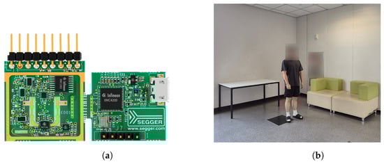 Radar sensor used and experimental environment: (a) radar sensor; (b) experimental environment.