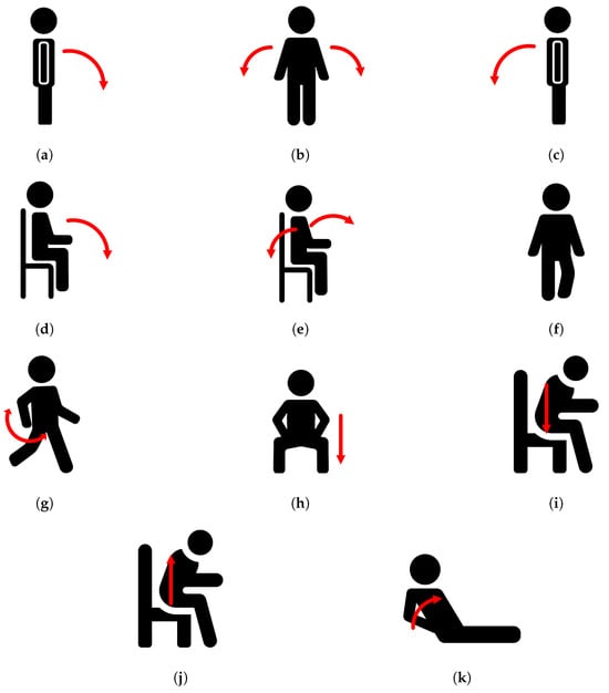 Examples of actions: (a) standing and then falling forward; (b) standing and then falling to the left/right; (c) standing and then falling backward; (d) sitting and then falling forward; (e) sitting and then falling to the left/right; (f) walking slowly without moving arms; (g) walking quickly whiles winging arms; (h) squatting; (i) sitting on a chair; (j) standing up from sitting on a chair; (k) lying down and then lifting the upper body. Arrows indicate the direction of movement of the upper body or arm.