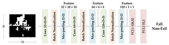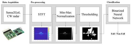 Figure 3 shows the overall structure of the proposed method. In the first step, the data acquired from the CW radar were preprocessed to generate a spectrogram that represented the micro-Doppler signature caused by human movement. The preprocessing consisted of STFT, min-max normalization, and thresholding. In the second step, the generated spectrogram was input into the BNN to detect falls. During this process, features were extracted and classified through the convolution layer (CL) and fully connected layer (FCL).