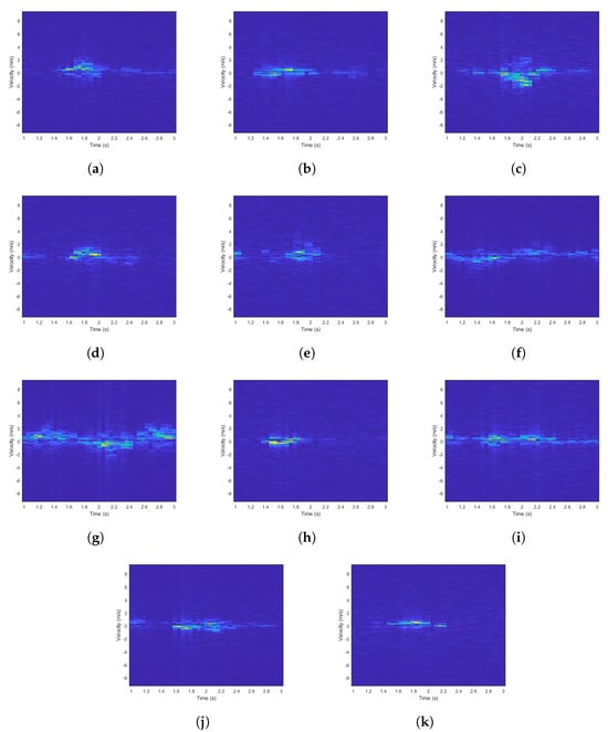 When a target moves, the received and transmitted radar signals have different frequencies, which is known as the Doppler effect. The difference between the two frequencies is referred to as the Doppler frequency. If vibration or rotational movement is added to a moving object, an additional Doppler effect, called the micro-Doppler effect, occurs. FFT is a signal processing method that converts a signal from the time domain to the frequency domain. Because FFT is applied to the entire signal, it cannot detect the micro-Doppler signature, which is a subtle signal over short periods of time. Therefore, STFT, which divides the entire signal into intervals and performs FFT operations, was used. The calculation process is shown in Equation (1). Since STFT performs FFT on segmented signals, it provides time information and allows the signal to be represented as a spectrogram in the time-frequency domain. To perform STFT, three parameters must be determined: The first is the window size, which is the length of the signal on which the FFT is to be performed. The second is the window overlap ratio, which determines how much the windows overlap to perform the STFT. The third is the FFT point. The STFT parameters used in the proposed method were a window size of 128, window overlap ratio of 50%, and 128 FFT points. Examples of the spectrograms for actions (a)–(k) are shown in Figure 4.