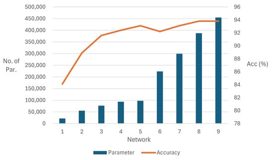 Figure 7 shows the number of network parameters and accuracy trend. The experimental results showed that as the number of parameters increased, the accuracy increased and then converged. Network 5 performs much better than Networks 1–4 and slightly worse than Networks 7–9. However, Network 5 has much fewer parameters compared to the accuracy difference with networks 7–9. Therefore, this network is best suited for lightweight applications. The detailed structure of the proposed network is shown in Figure 8. The number of channels in the three convolution layers were 32, 64, and 128, and the kernel sizes were 5, 3, and 3. Batch normalization and max-pooling layers were applied after all convolution layers. A hard hyperbolic tangent was used as the activation function.