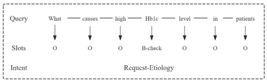 Intent detection and slot filling share a common foundation in language understanding and are highly dependent on each other. Given the utterance, “What causes high Hb1c levels in patients?”, its intent category is “Request-Etiology”, and the slot is labelled “B-Check”. An example of intent detection and slot filling for this utterance is shown in Figure 1.