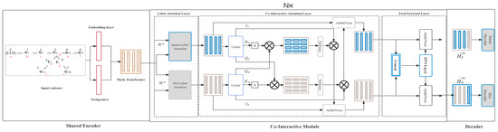Owing to the strong correlation between intent detection and slot filling, some joint models based on multi-task learning frameworks have been widely proposed to simultaneously tackle both intent detection and slot filling [8]. However, certain existing joint models [9,10,11] exclusively employ intent information in a unidirectional fashion to optimize slot filling while overlooking the potential guiding influence that slot information could exert on intent detection [12]. In response to the shortcomings of existing joint models, Qin et al. [12] introduced a co-interactive transformer specifically designed for joint intent detection and slot filling. This transformer utilizes the bidirectional information flow between intent detection and slot filling to model the relationship between the two tasks.