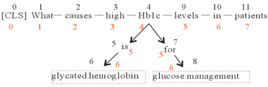 Injecting the triplets from the knowledge graph into the original utterance may lead to distortions in the semantics of the utterance without proper constraints. The seeing layer processes the structured information within the sentence tree and generates a visible matrix, which is used to control the visibility scope of each token in the sentence tree. Taking the sentence tree in Figure 4 as an example, “glycated hemoglobin” is only used to explain “Hb1c” and is not related to “levels”. Therefore, “glycated hemoglobin” is visible to “Hb1c” but invisible to “levels”. The entity visibility matrix corresponding to the sentence tree in Figure 4 is shown in Figure 6.