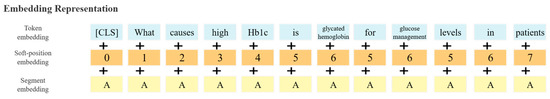 Soft position embedding works by assigning each token a dynamically adjusted position index, which needs to be set according to the actual semantics and is reflected through the self-attention scores in the mask transformer to indicate the relative positional relationships between tokens, rather than their absolute physical positions. Considering the sentence tree in Figure 3 as an example, the vector representations obtained after the text embedding layer are shown in Figure 5. In Figure 5, “+”sign is used to denote the summation of different types of embedding vectors and A is used as an identifier to mark sentence segments.