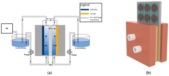 Schematic representation of the electrochemical test: two peristaltic pumps are used for electrolyte recirculation, and the catholyte reservoir is sealed and connected to the gas chromatograph for product analysis (reprinted with permissions under the Creative Commons Attribution (CCA) 4.0 from []) (a); sketch of integrated PV–EC device (b).